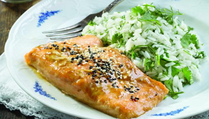 Лосось в азиатском стиле Ингредиенты на 6 порций: 1 кг филе лосося, без костей и кожи (его средняя, толстая часть) Для маринада: • 1 см свежего корня имбиря, очищенного и крупно натертого • 1/2 чайной ложки кунжутного масла • 2 ст. ложки сладкого или острого соуса чили • 2 ст. ложки оливкового масла • 2 ст. ложки настоящего майонеза «Тельма» • 2 ст. ложки силана • 2 ст. ложки лимонного сока • 2 мелко нарезанных зубчика чеснока Для азиатского фасолевого салата; • 1/4 пакета замороженной или свежей фасоли • 2 очищенные моркови • 100 г крупно порезанного жареного арахиса, (при желании) Заправка для салата: • 3 ст. ложки оливкового масла • 3 ст. ложки лимонного сока • 4 ст. ложки силана или кленового сиропа • 4 ст. ложки соуса чили • 2 нарезанных зубчика чеснока Соль по вкусу Для украшения; 1/3 пучка порезанного лука-ирита (или 2 пера зеленый лук ветви в небольших колец) Приготовление: 1. Порежьте филе лосося на кубики размером 3-4 см. 2. В глубокой миске смешайте все ингредиенты для маринада до получения однородной массы. 3. Добавьте кубики лосося и осторожно перемешайте. Накройте миску полиэтиленовой пленкой и поставьте на 15 минут или несколько часов в холодильник, чтобы рыба пропиталась маринадом. 4. Достаньте рыбу из маринада и быстро обжарьте до золотистого цвета со всех сторон на ребристой сковороде с добавлением 1 ложки оливкового масла. 5. Салат: отварите фасоль в подсоленной воде в течение 5-7 минут до небольшого смягчения. Процедите и положите в миску с водой и льдом, чтобы остановить процесс ее приготовления. Снова процедите. Порежьте фасоль на небольшие кусочки. Морковь нарежьте тонкими полосками с помощью овощечистки или терки-мандолины. Смешай те фасоль и морковь в большом салатнике. 6. Заправка для салата: поместите все ингредиенты в небольшую банку и хорошо взболтайте. 7. Полейте салат заправкой и посыпьте арахисом. 8. Сервировка: выложите кубики лосося на тарелку, посыпьте зеленым луком и подавайте вместе с салатом.