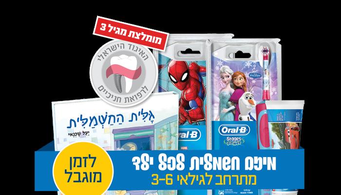 Благодаря всем этим преимуществам детская электрическая щетка Oral-B рекомендуется Ассоциацией стоматологов Израиля детям с 3-летнего возраста! Oral-B в сотрудничестве с сетью «Супер-фарм» и Израильской стоматологической ассоциацией выпускают в продажу набор, в который входят электрическая зубная щетка для детей с изображением Эльзы или Человека-паука и со встроенным таймером чистки на 2 минуты, детская зубная паста и руководство по правильной чистке зубов, одобренное Израильской стоматологической ассоциацией. Набор можно будет купить в отделениях «Супер-фарм» во время Недели здоровья полости рта по уникальной цене – около 49,90 шекелей вместо 189,90. Проект Oral-B «Электрическая зубная щетка - каждому ребенку» будет проходить с 24 марта по 26 апреля.