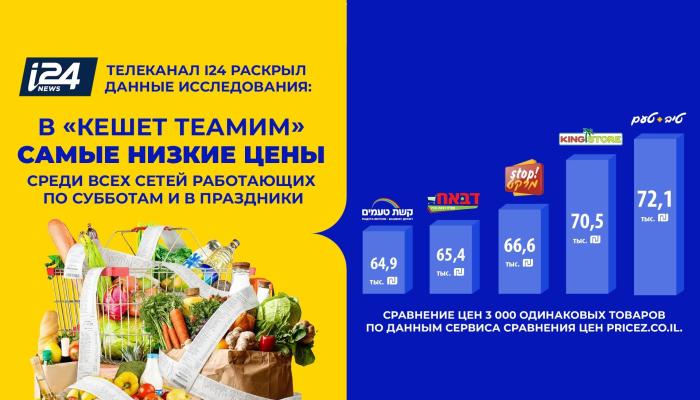 Эксперты израильского телеканала i24 подтверждают: «Кешет Теамим» уверенно занимает первое место в рейтинге самых дешевых цен среди сетей, работающих по субботам и в праздники.